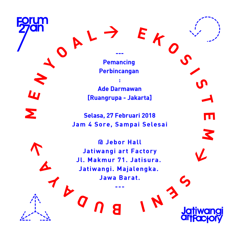 Forum 27an mengundang untuk hadir di diskusi bulanan tahun kesepuluh. TEMA : Memyoal Ekosistem Seni Budaya. Pemancing Pembicaraan : Ade Darmawan (ruangrupa Jakarta) HARI selasa Tanggal 27 pebruari 2018 jam 16.00 sd Selesai. TEMPAT JaF jebor hall jatisura. Mari datang berbincang ketemu dengan orang orang.